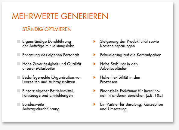 profitieren von unseren rund 3.000 Mitarbeitern an über 30 Standorten, indem die Produktivität ihrer Unternehmen steigt. Wir hinterfragen das Bestehende, um das Zukünftige nachhaltig besser zu gestalten. Das gelingt uns mit viel Erfahrung, bewährten Methoden und voller Transparenz. Mit innovativen Lösungen tragen wir dazu bei, dass Sie Kosten einsparen, Ihre Wettbewerbsfähigkeit steigern und sich auf Kernkompetenzen fokussieren können.